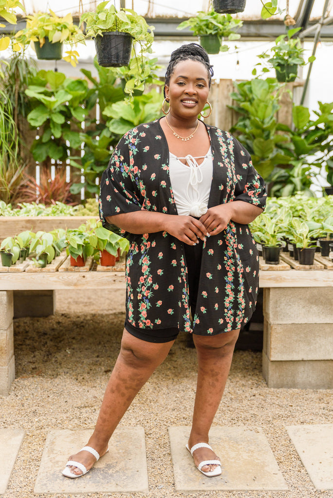 Stay up to date with this season's current trends with the Moment In Time Kimono! What's not to love about this piece!? Featuring a pink and blue floral print on sheer black fabric, an open front, dramatic gathered sleeves, and a flowy silhouette. Pair with denim and a tank or throw it over a dress, either way you're going to look stunning!