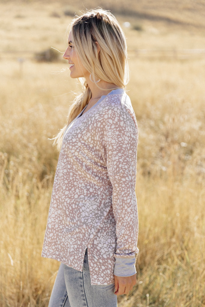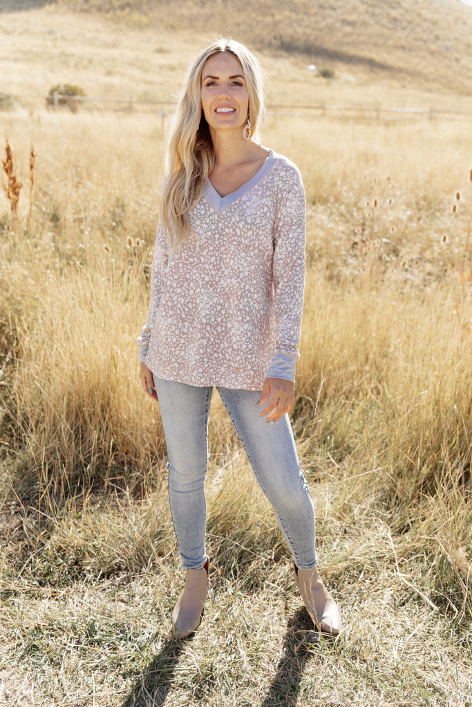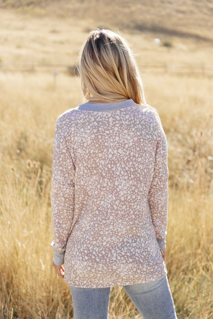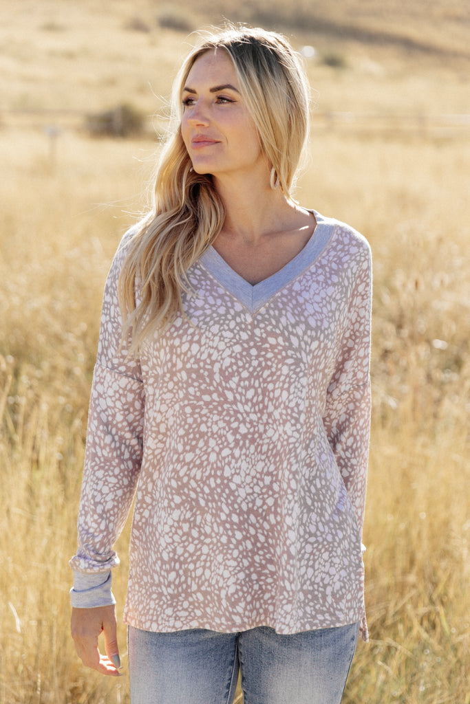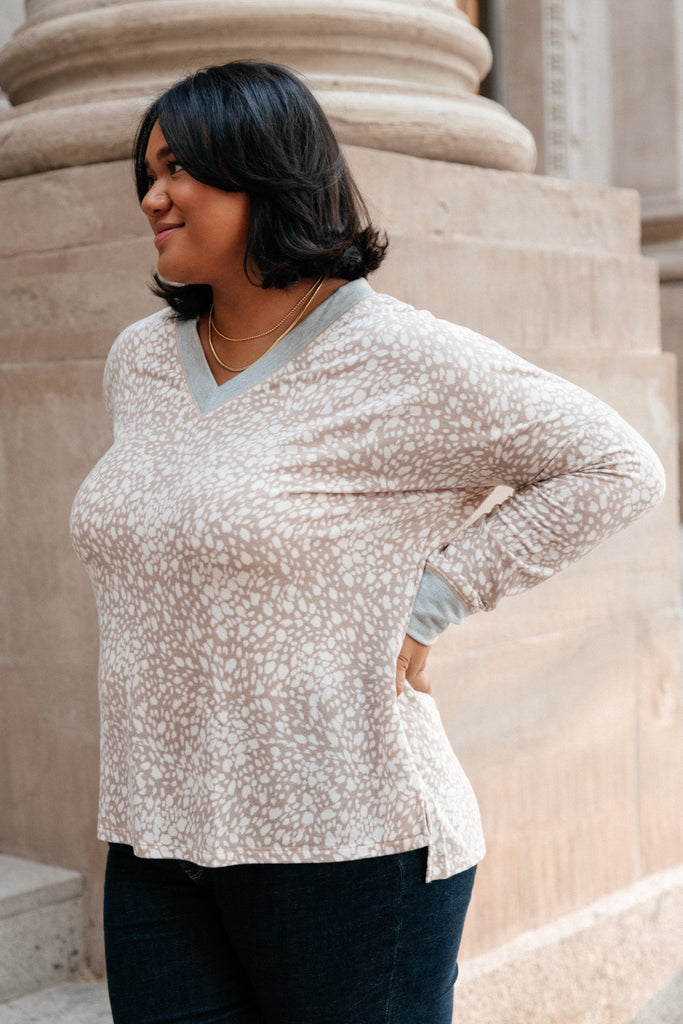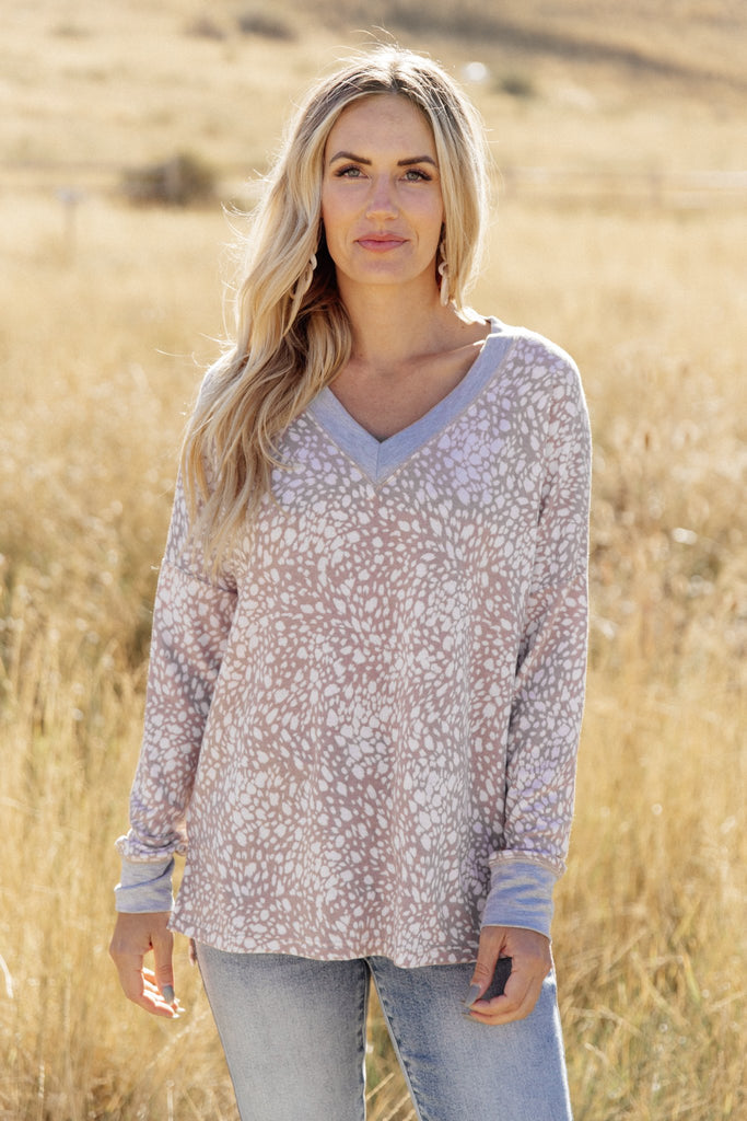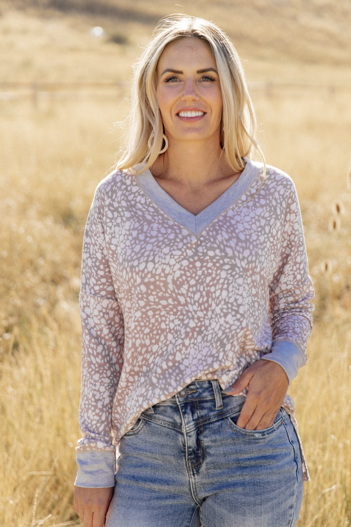Keywords: Gray Top, Animal Print, Long Sleeve Top, V Neck