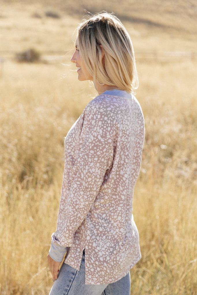 The Spotted In The City Top is an abstract printed gray top with solid colored accents at the wrists and neckline. This top is soft and stretchy with a high low hemline. Pair this top with jeans or leggings for a fall time look.