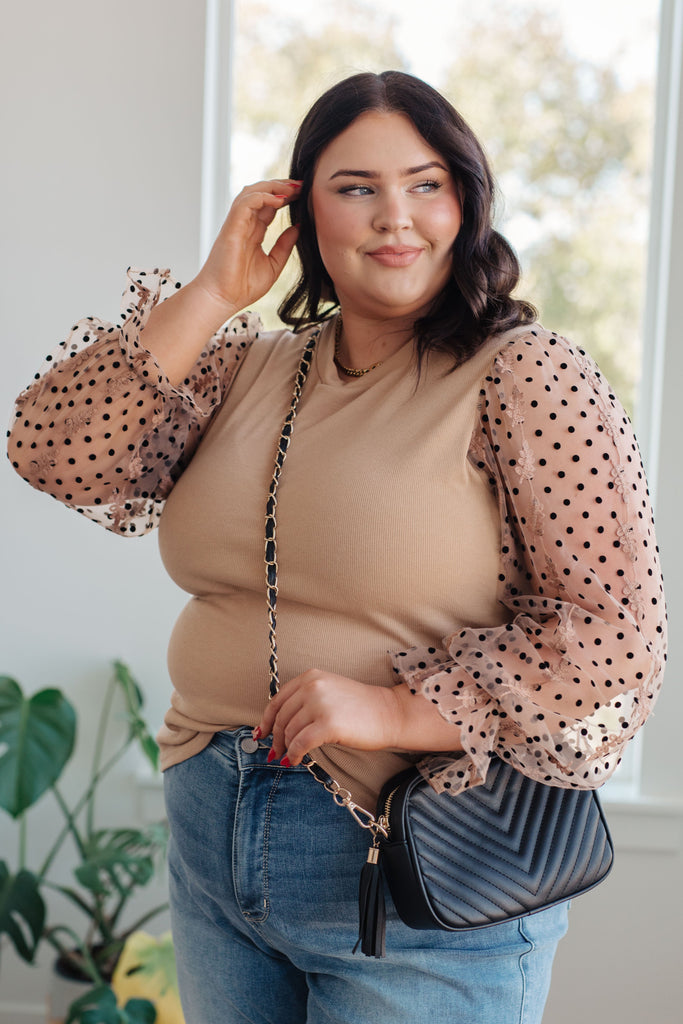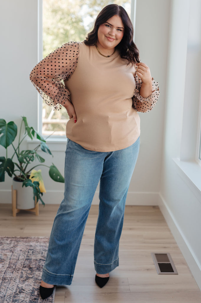 Be fashion-forward in our exclusive Dots on My Sleeves Blouse! This slim-fit top features sheer sleeves embellished with velvet polka dots and an embroidered floral pattern. The round neckline gives the perfect finishing touch to this unique style. Stay chic and look fabulous in this essential blouse!