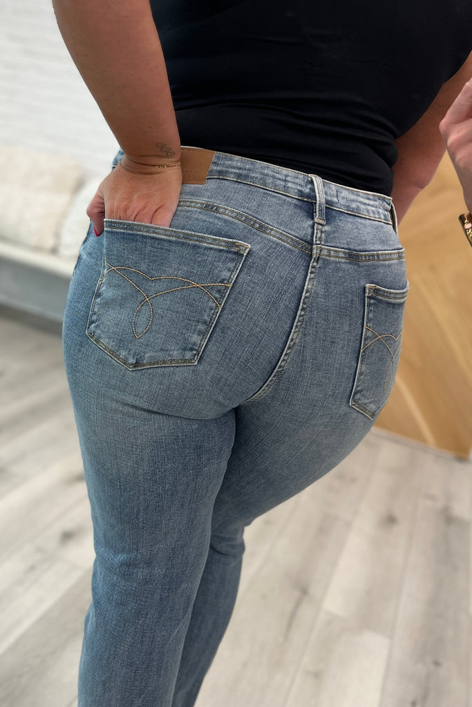 Add a modern twist to your wardrobe with the Elodie Mid Rise Distressed Boyfriend Jeans from Judy Blue! These unique jeans feature a medium wash, distressed knee, and optional cuffed hem for an edgy look. Enjoy the ultimate comfort of a relaxed, boyfriend fit. Always on trend and never out of style!