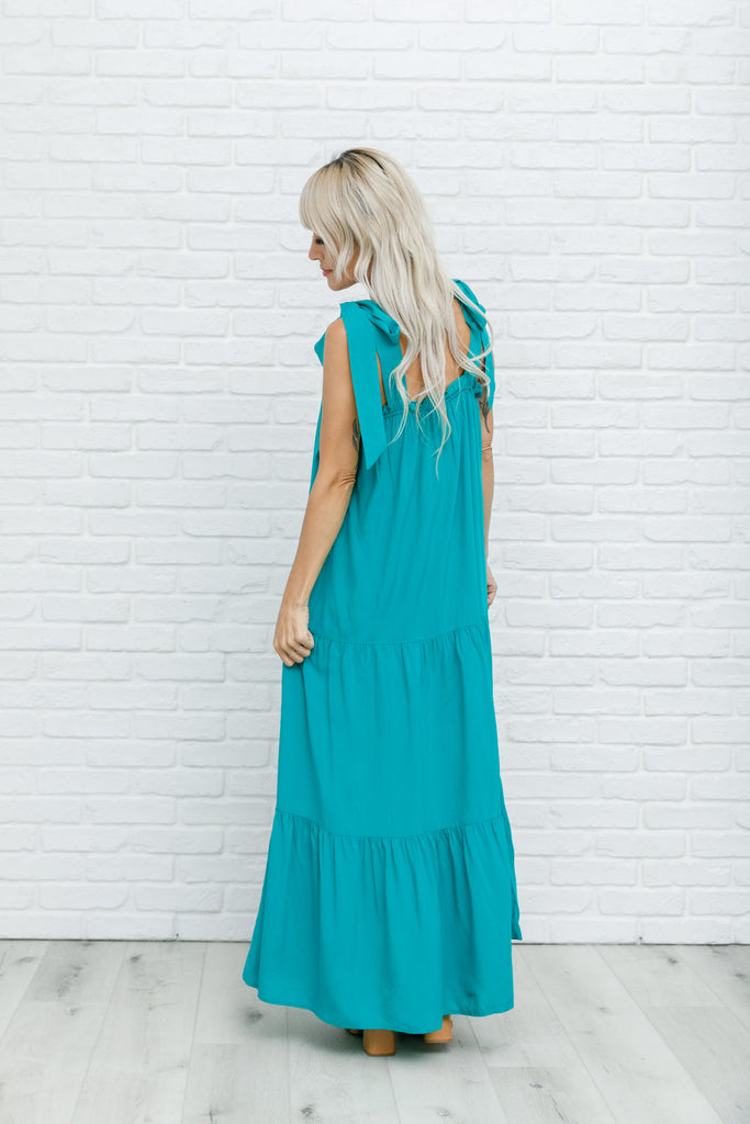 The perfect vacay look starts with the Venetian Coast Dress! A sea green teal, tiered, maxi silhouette shapes this stunning dress. A tie, shoulder strap detail makes this dress fully adjustable for desired fit. Let this dress fill that last space in your suitcase!